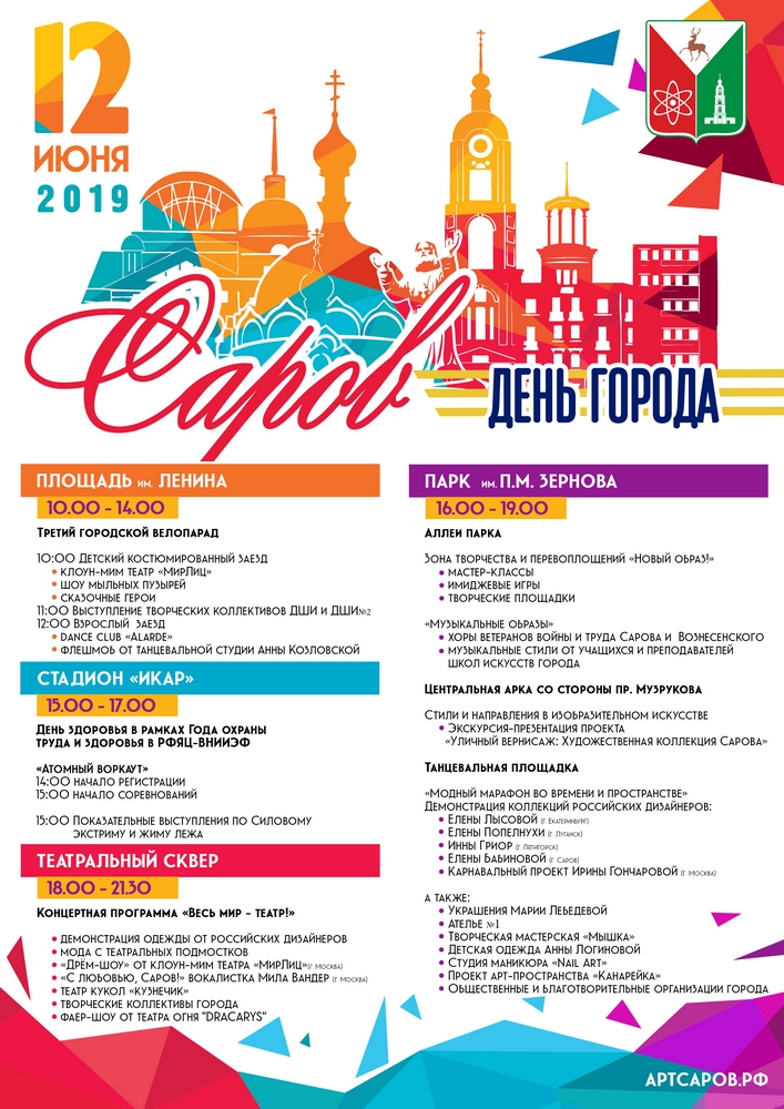 АфишаНет событий в ближайшее время | День Сарова — 201912июн @ Разное Торжественные мероприятия, приуроченные ко Дню города и Дню России, пройдут в Сарове на 4-х площадках 12 июня. Муниципалитетом и общественными организациями приготовлена обширная развлекательная программа. Площадь Ленина (10:00 — 14:00): С 10:00 начнутся детские велозаезды (вокруг памятника Ленину), всех участников которых ждут призы. Также гостей ожидают выступления творческих коллективов города, шоу мыльных пузырей и московского мим-театра «МирЛиц». В 12:00 начнется велопарад для взрослых по маршруту: площадь Ленина — Комсомольская площадь — площадь Ленина. Кроме того, свои номера приготовили танцевальная студия Анны Козловской и школа танцев «Alardе». Стадион «Икар» (15:00 — 17:00): С 15:00 начнутся показательные выступления по силовому экстриму и русскому жиму, а также вторые городские соревнования в рамках проекта «Атомный воркаут», на который приглашены ведущие российские спортсмены в этом направлении: Владислав Богданов, Михаил Китаев и Наталья Малеева. Парк им.Зернова (16:00 — 19:00): Аллеи парка: творческие мастер-классы, имиджевые игры, выступления музыкальных коллективов, ветеранские хоровые ансамбли; Центральная арка — презентация коллекции «Уличный вернисаж: Художественная коллекция Сарова». Танцевальная площадка: Демонстрация коллекций дизайнеров одежды из Москвы, Луганска, Екатеринбурга, Пятигорска и Сарова (в рамках проекта Елены Бабиновой «Марафон моды и красоты в Сарове»). Театральный сквер (18:00-21-30): Огневое шоу «Dracarys» (г.Саров), «Дрем-шоу» от мим-театра «МирЛиц» (г.Москва), выступление вокалистки Милы Вандер (г.Москва), демонстрация одежды российских дизайнеров и выступления творческих коллективов города. Нет комментариев Написать |